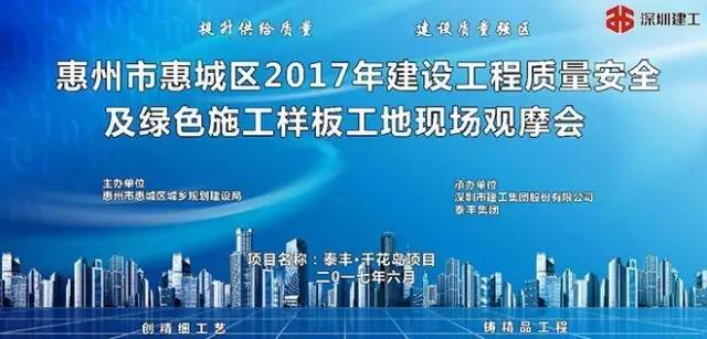 6月8日上午,由惠州市惠城區(qū)城鄉(xiāng)規(guī)劃建設(shè)局主辦,深圳市泰豐投資集團(tuán)有限公司、深圳市建工集團(tuán)股份有限公司承辦的——“惠州市惠城區(qū)2017年建設(shè)工程質(zhì)量安全及綠色施工樣板工地現(xiàn)場觀摩會”,在惠城區(qū)金山湖泰豐·千花島項目舉行。