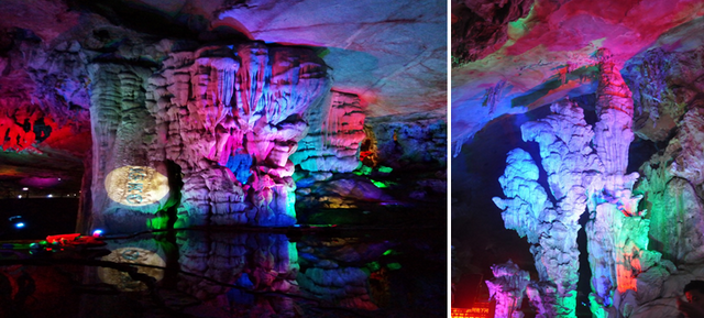 洞中有洞、有河、有橋,鐘乳石在燈光的影射下,展現(xiàn)出千姿百態(tài)、瑰麗多彩、神秘莫測(cè)之態(tài)勢(shì)。
